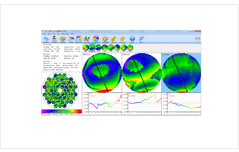 通過特定波長激光激發(fā)指定材料,獲得熒光光譜,對熒光光譜進行采集并后處理呈現(xiàn)熒光各項特征。波長覆蓋紫外到近紅外(200-2500nm),可對2-12寸外延片進行測量。